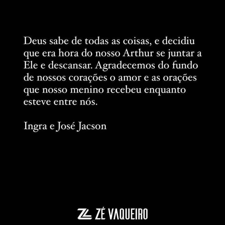 “Deus sabe de todas as coisas, e decidiu que era hora do nosso Arthur se juntar a Ele e descansar. Agradecemos do fundo de nossos corações o amor e as orações que nosso menino recebeu enquanto estava entre nós”, publicaram eles no Instagram.