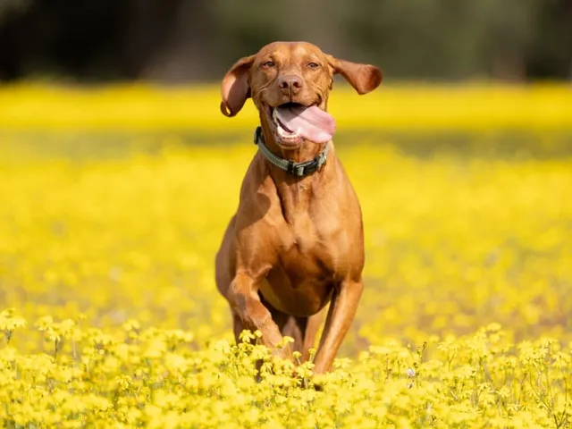 De origem húngara, o vizsla é um cachorro elegante, magro e atlético. Tem porte médio e pelagem curta e dourada. A raça é conhecida por sua obediência, energia e forte vínculo com o tutor. Por ter sido criado para caçar e correr por grandes áreas, se adapta bem a treinos intensos e longas corridas. Seu comportamento dócil também facilita o controle durante os trajetos.