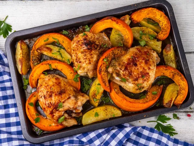 1. Frango assado com abóbora e batata rústica